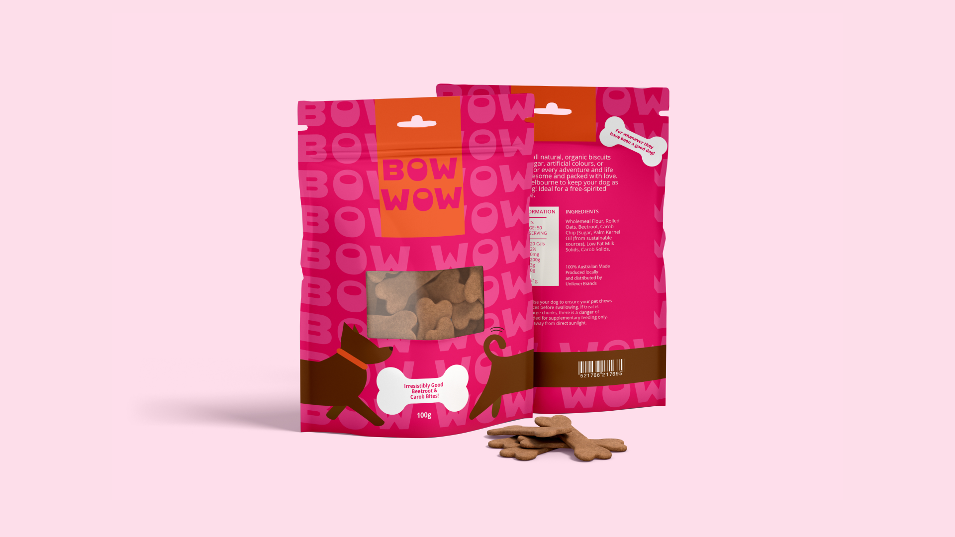 Packaging for healthy artisanal dog treats baked in Melbourne, for adventurous dogs.